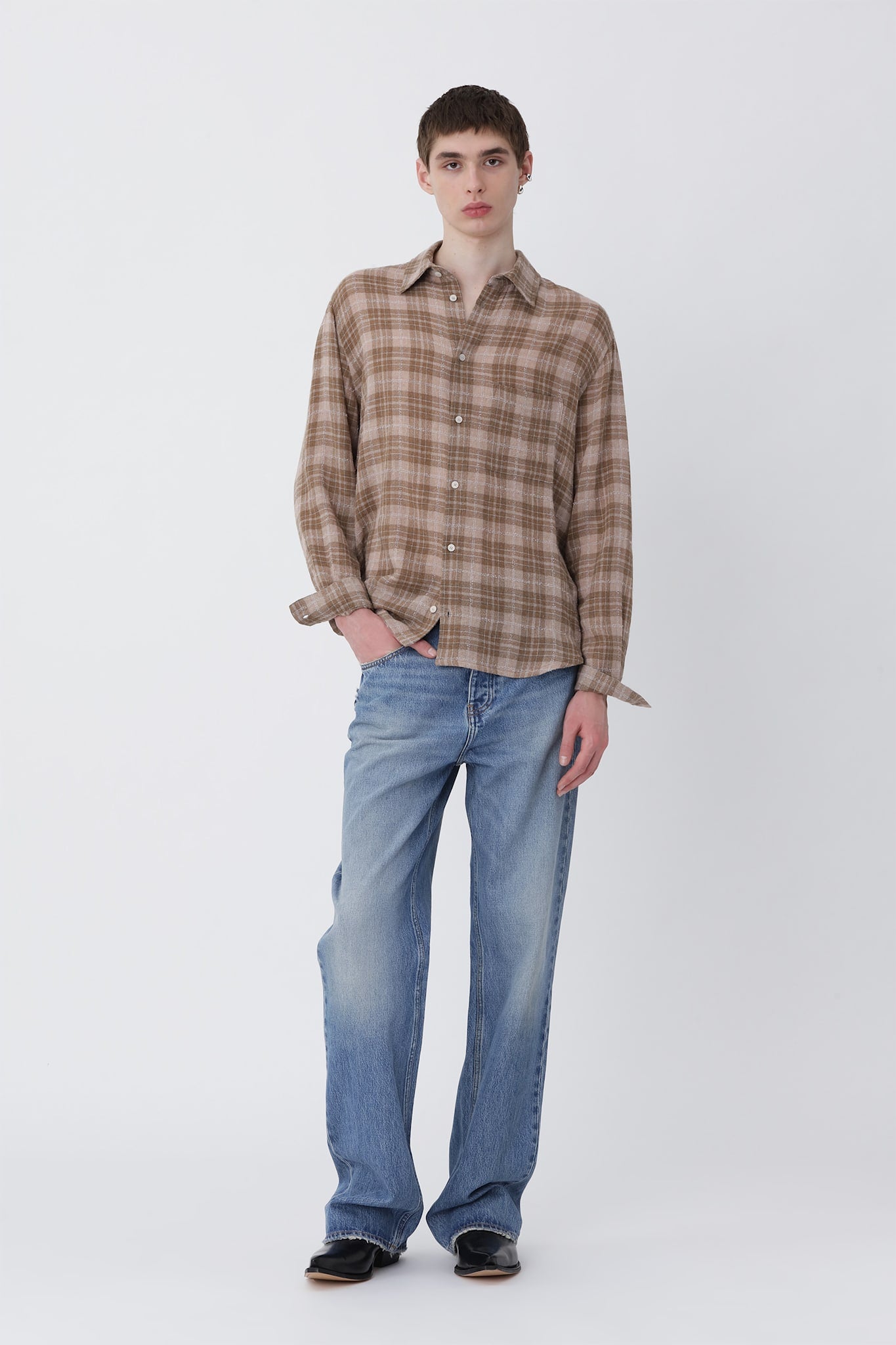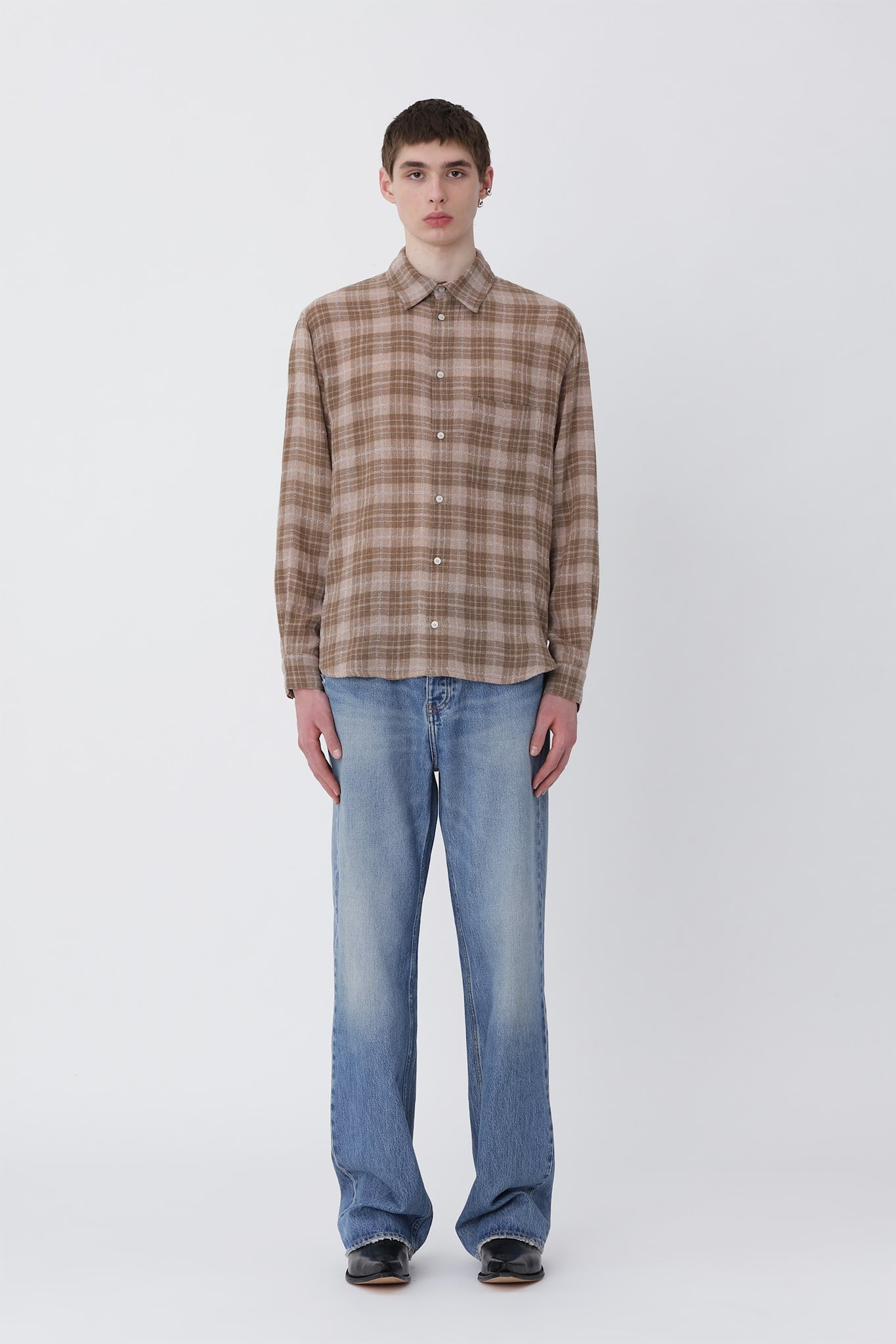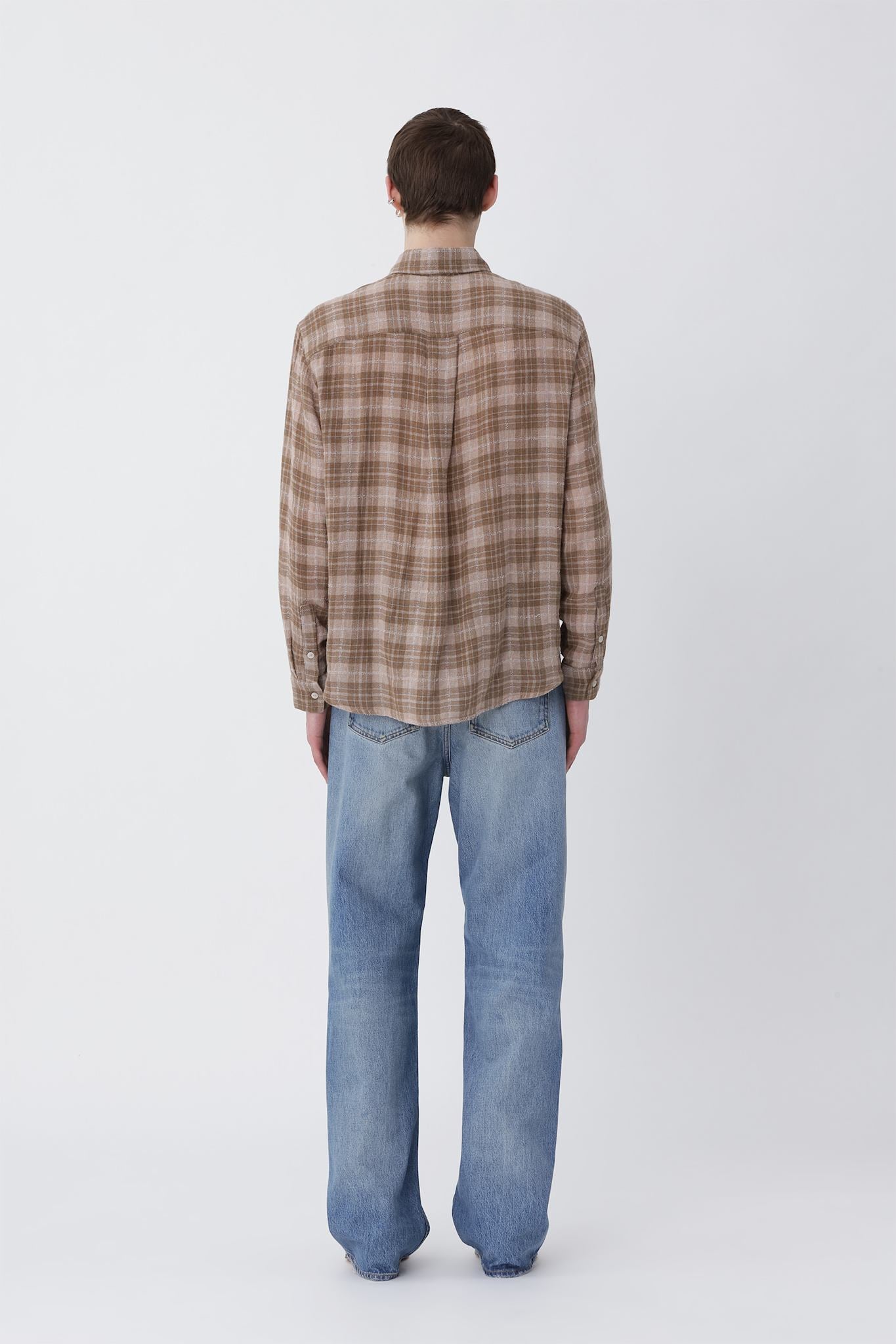 The Pete Shirt is a fitted style with a straight body and rounded hemline. Crafted from a light, open-weave viscose and cotton blend in a brown check pattern, it’s finished with white button closures at the front for a clean, classic look.