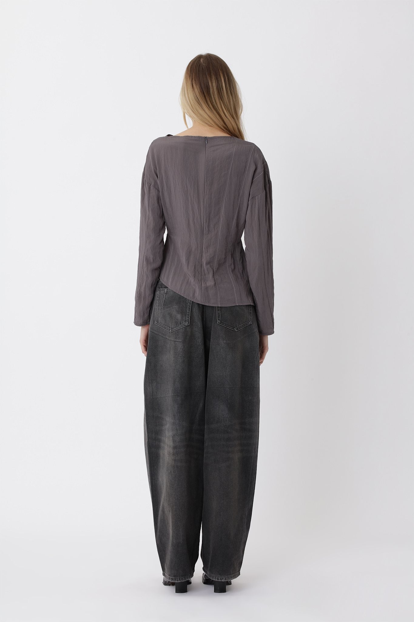 The Biro shirt is a lightweight asymmetric shirt with a modern silhouette. The left side features cutlines that follow the body with contrast stitching, while the right side has a small slit at the waist. Designed with an open neck and slightly dropped shoulders for a relaxed feel.