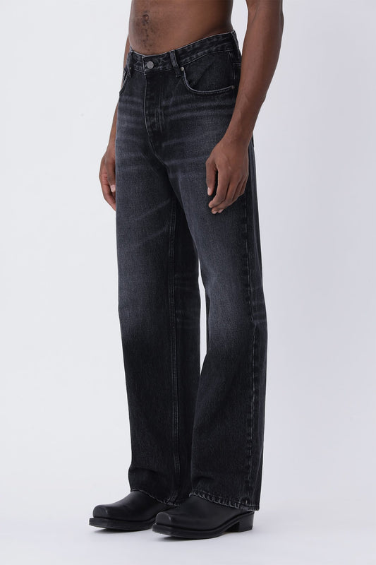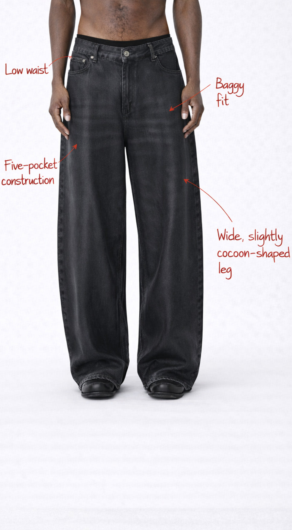 The Lyon jeans are unisex and designed with a baggy fit, low waist, and a wide, slightly cocoon-shaped leg. They can be sized down for a higher placement on the waist. Crafted from 100% organic cotton in a black coated wash, they are finished with a metal logo button and zipper closure.