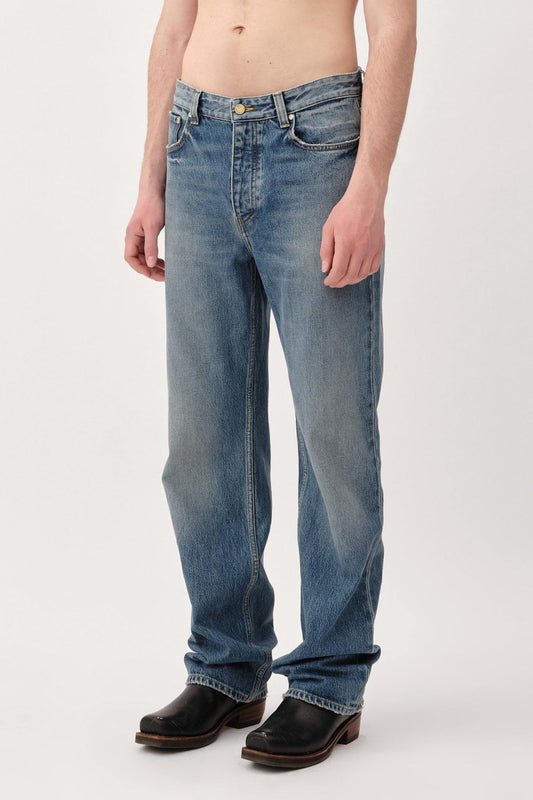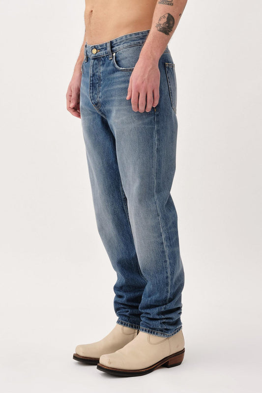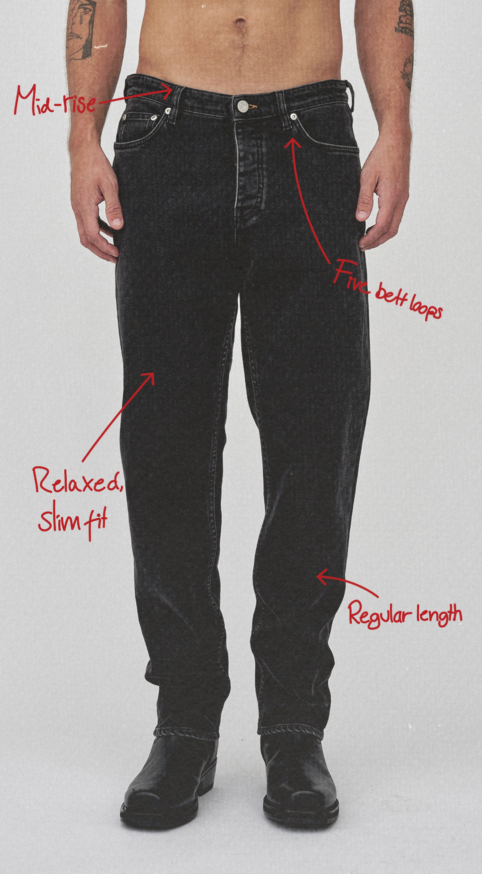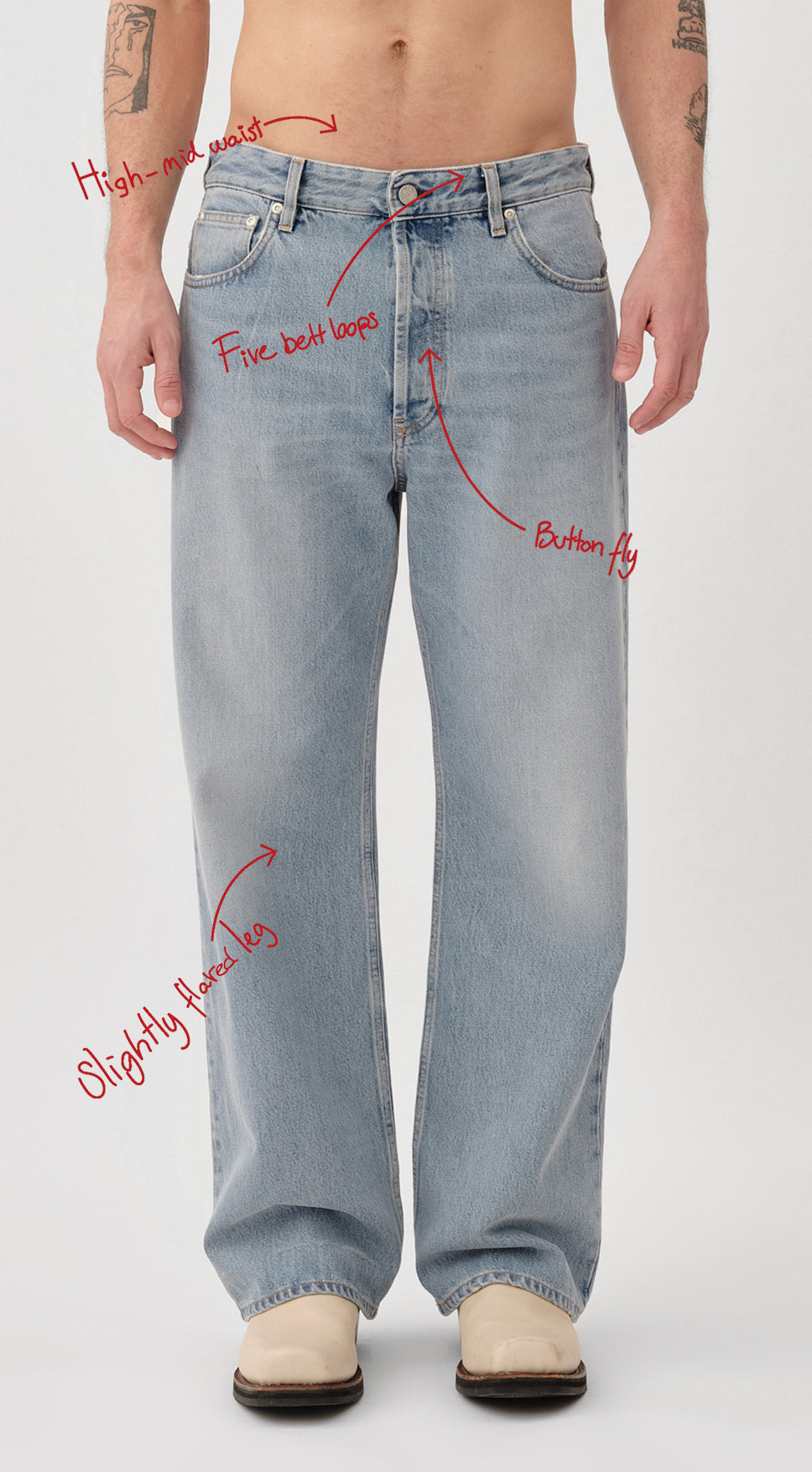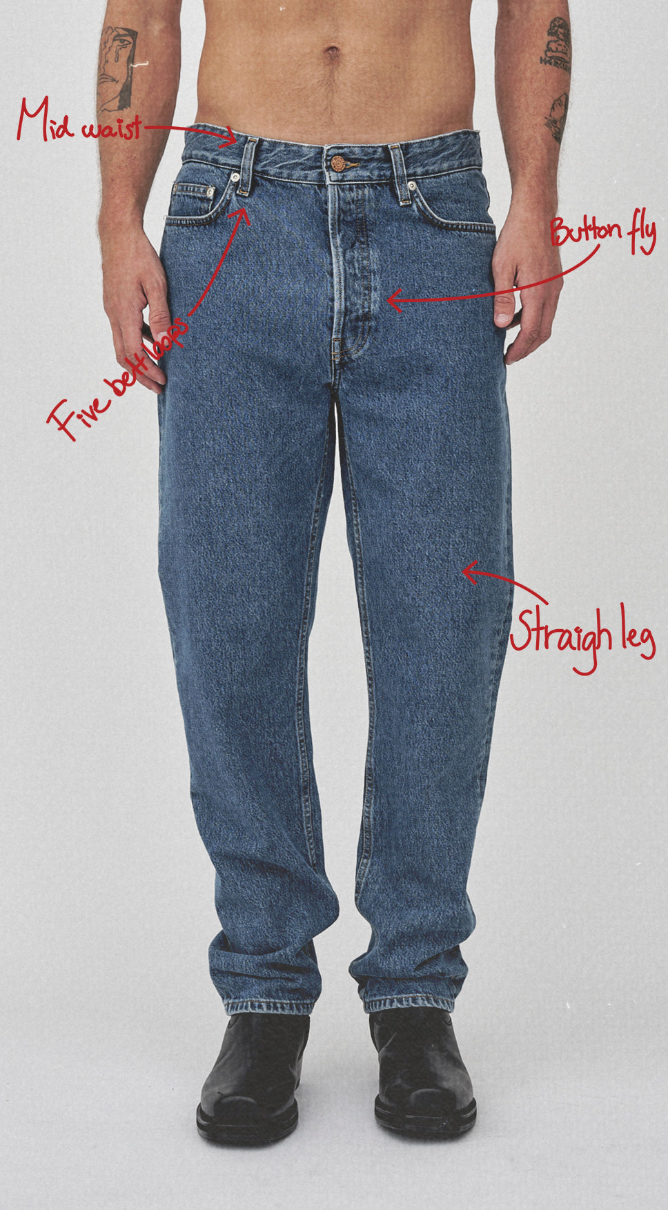 “Bill” is a 90’s vintage-feel jeans with a straight leg, mid-waist, button fly and regular length. The jeans construction comes with five pockets and five belt loops. They feature branded logo buttons, rivets and leather labels, as well as our signature dart at the back pockets.