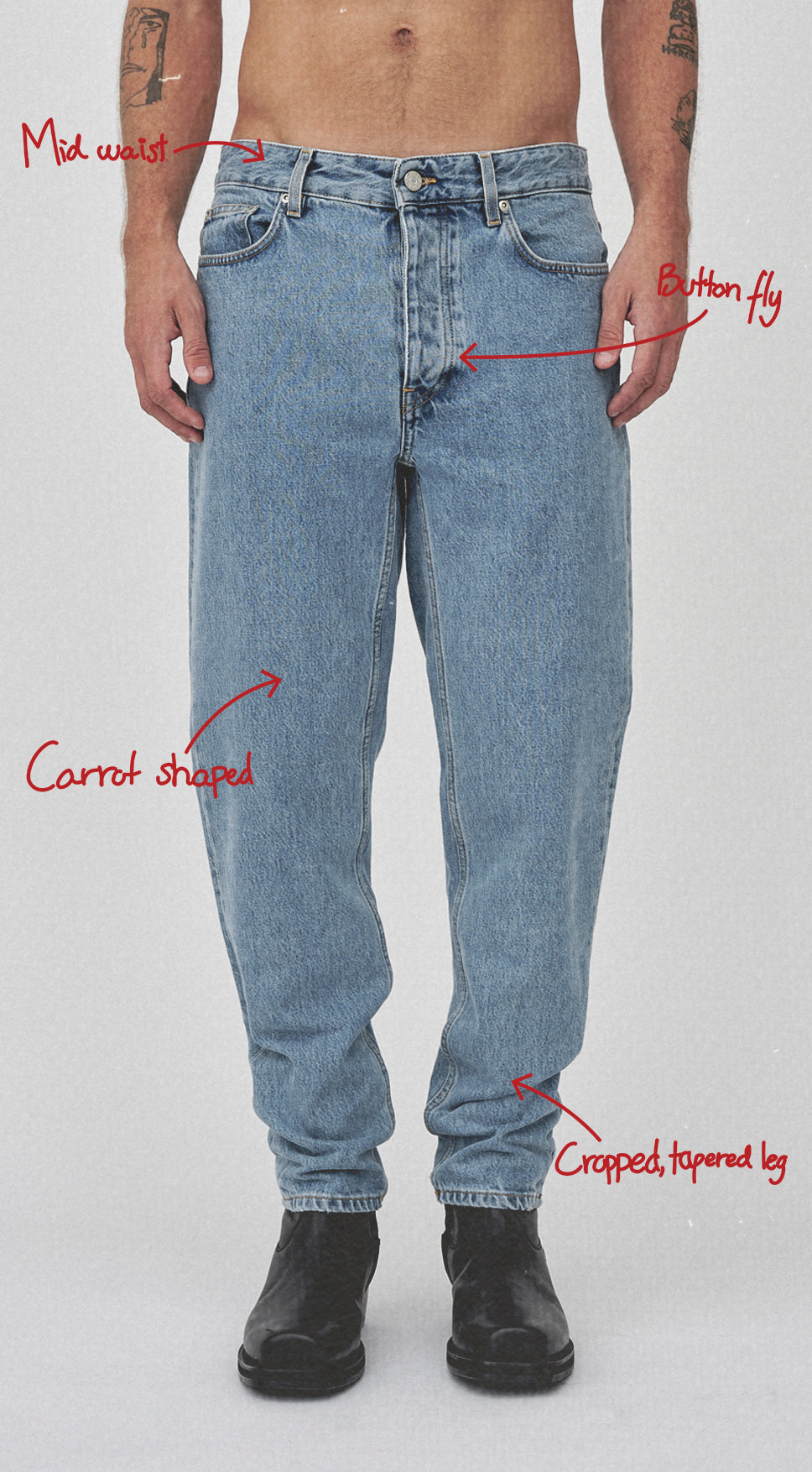 Ben” is a loose fitted carrot-shaped jeans with a mid-waist, button fly and a cropped, tapered leg. The jeans construction comes with five pockets and five belt loops. They feature branded logo buttons and rivets, leather label, along with our signature dart at the back pockets.