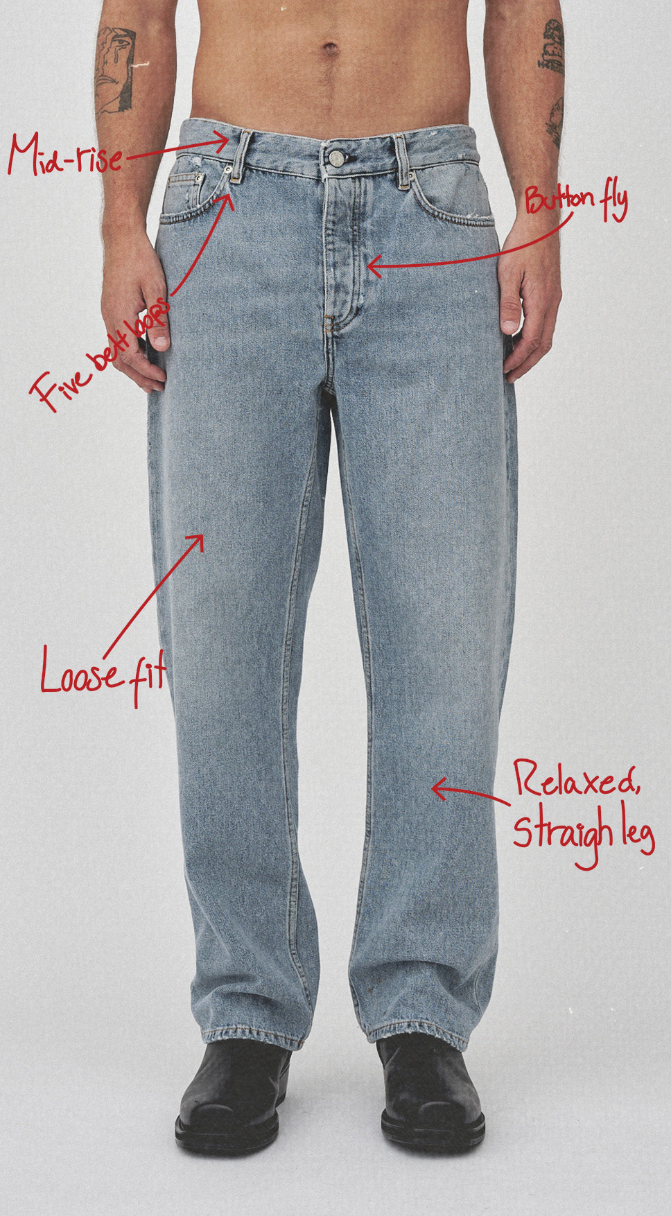 “Steve” is a 90’s loose fit jeans with a mid-rise, button fly and relaxed straight leg. The jeans construction comes with five pockets and five belt loops. They feature branded logo buttons, rivets and leather labels, as well as our signature dart at the back pockets.